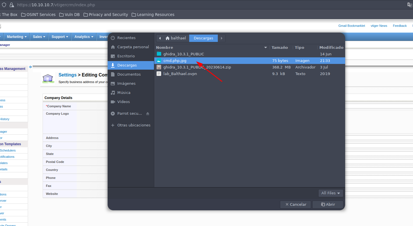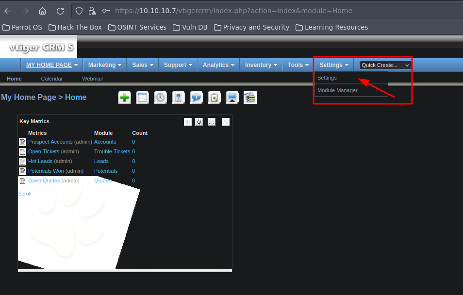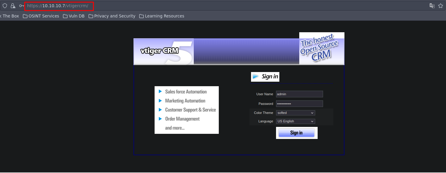 Usamos las credenciales que vimos en el exploit para ingresar al vtiger usurio:admin, Password: jEhdIekWmdjE