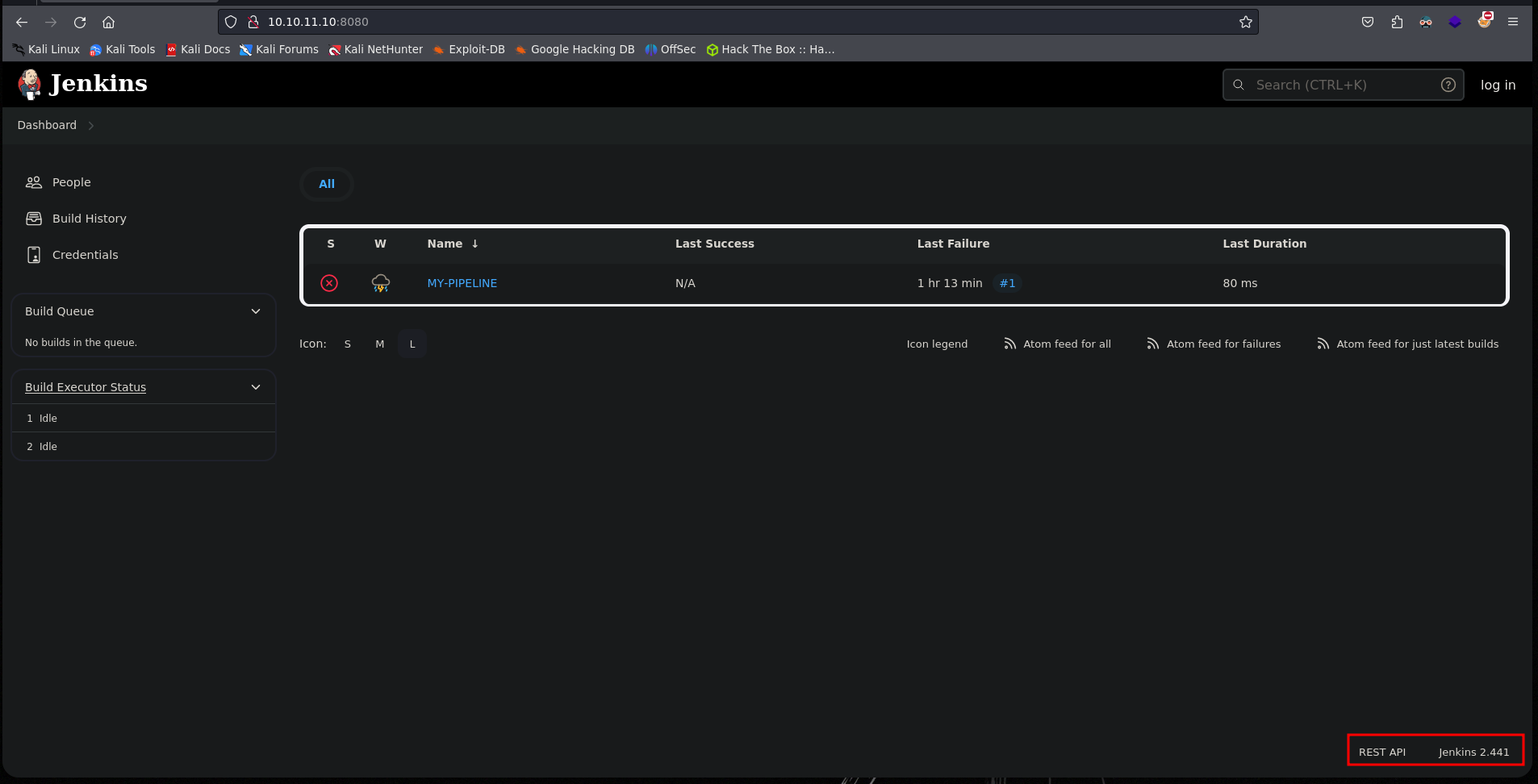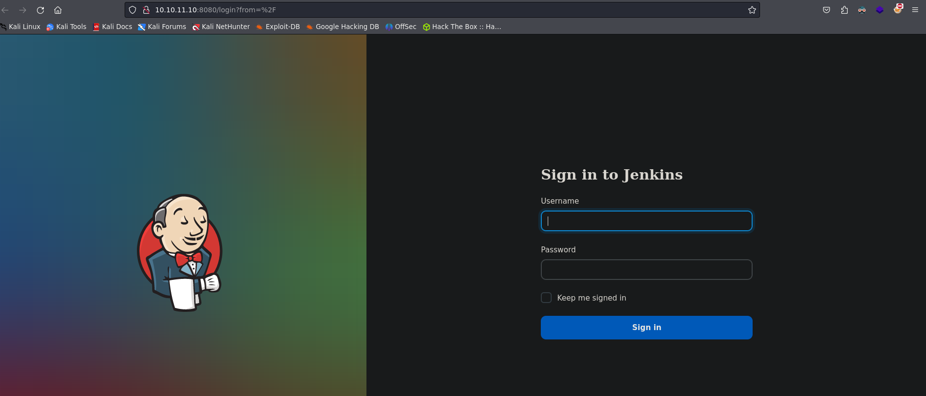 http://10.10.11.10:8080 [200 OK] Cookies[JSESSIONID.b686fb0d], Country[RESERVED][ZZ], HTML5, HTTPServer[Jetty(10.0.18)], HttpOnly[JSESSIONID.b686fb0d], IP[10.10.11.10], Jenkins[2.441], Jetty[10.0.18], OpenSearch[/opensearch.xml], Script[application/json,text/javascript], Title[Dashboard [Jenkins]], UncommonHeaders[x-content-type-options,x-hudson-theme,referrer-policy,cross-origin-opener-policy,x-hudson,x-jenkins,x-jenkins-session,x-instance-identity], X-Frame-Options[sameorigin]