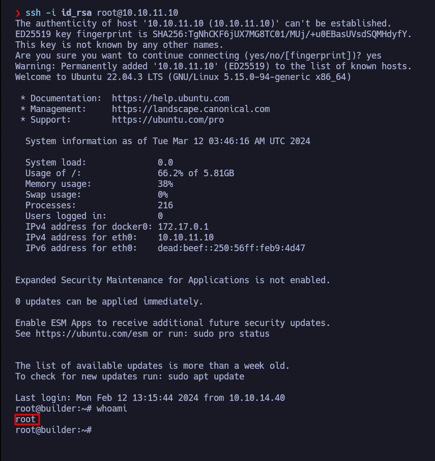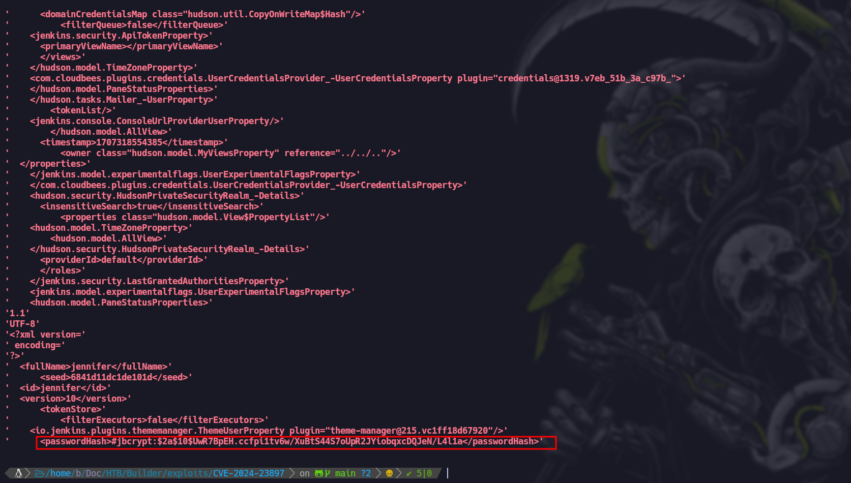 Builder es una máquina Linux de dificultad media que cuenta con una instancia de Jenkins. La instancia Jenkins es vulnerable a la vulnerabilidad [CVE-2024-23897] https://www.cvedetails.com/cve/[CVE-2024-23897] https://nvd.nist.gov/vuln/detail/CVE-2024-23897 que permite a usuarios no autenticados leer archivos arbitrarios en el sistema de archivos del controlador Jenkins. Un atacante es capaz de extraer el hash del nombre de usuario y contraseña del usuario de Jenkins jennifer. Utilizando las credenciales para iniciar sesión en la instancia remota de Jenkins, se explota una clave SSH cifrada para obtener acceso root en la máquina host.
