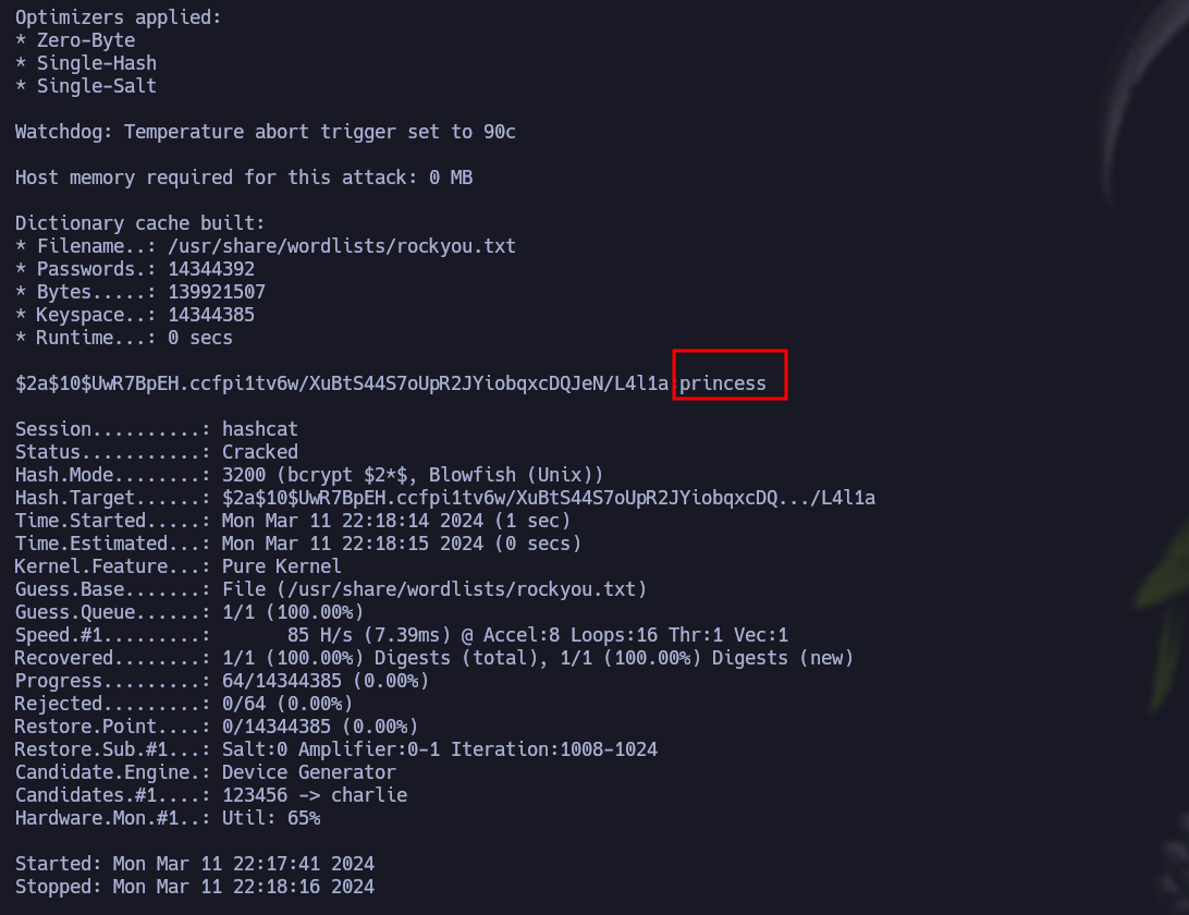 hashcat -a 0 -m 3200 hash /usr/share/wordlists/rockyou.txt