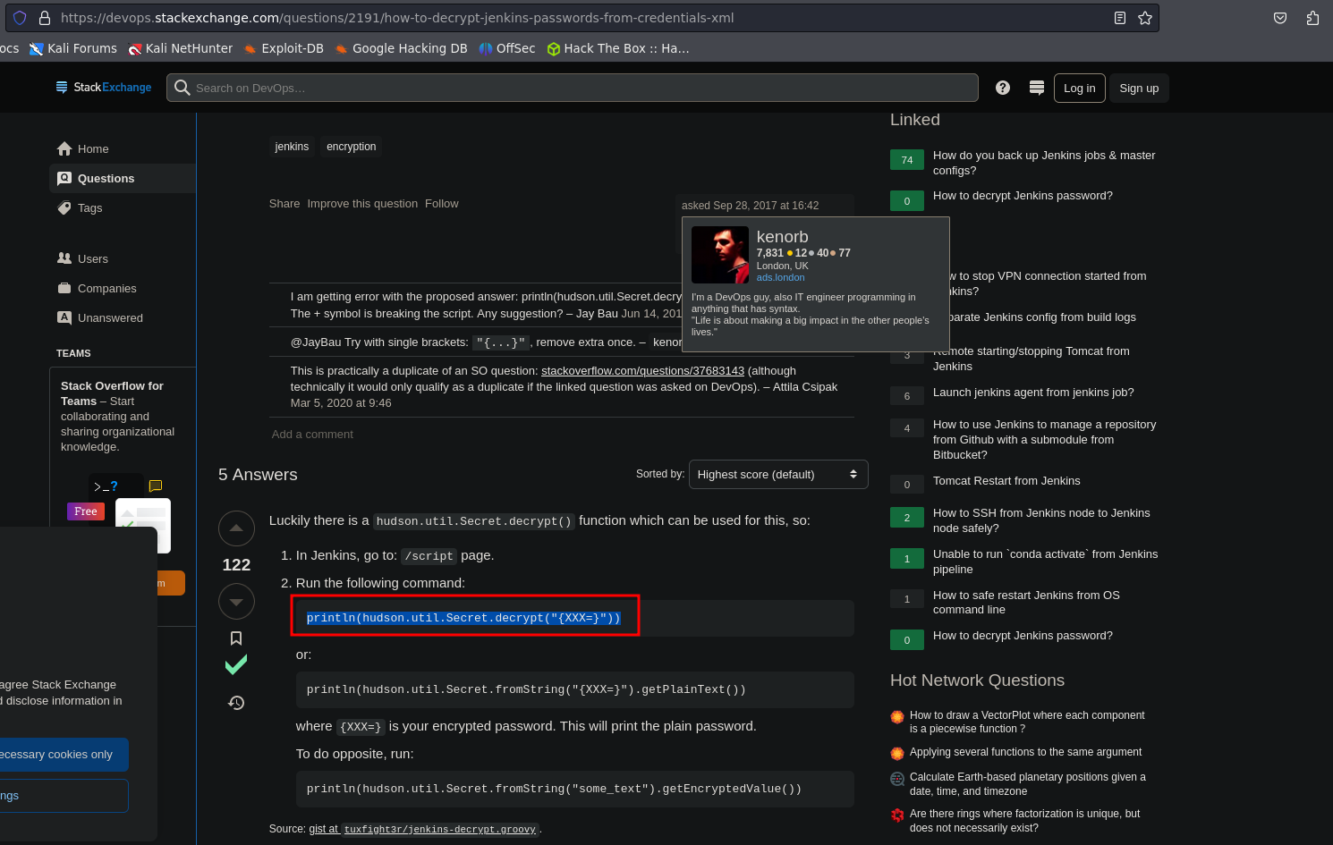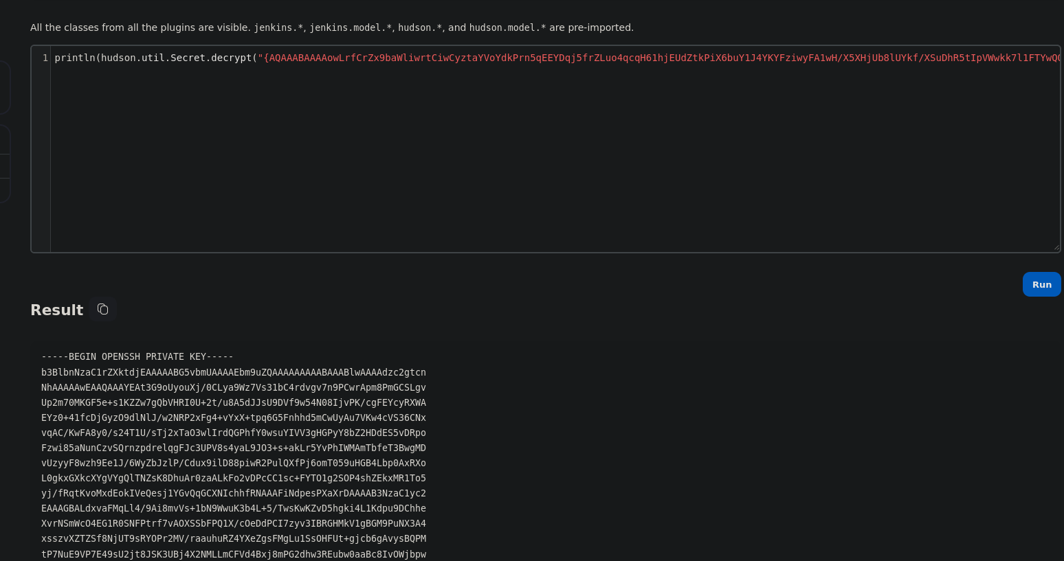 - En el jenkins existe una consola que ejecuta scrtipts, y podemos aprovecharnos de esta consola para que por medio de un comando de Groovy pueda descifrar la clave.