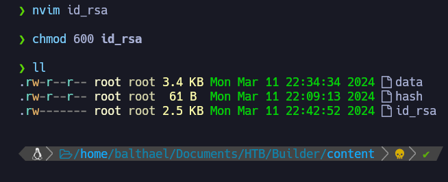 Logramos descifrar el contenido, lo guardamos como la id_rsa y le damos el permiso 600.