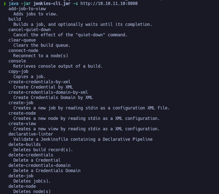 java -jar jenkins-cli.jar -s http://10.10.11.10:8080Con esta linea de comandos nos arroja una serie de instrucciones que puedo usar.
