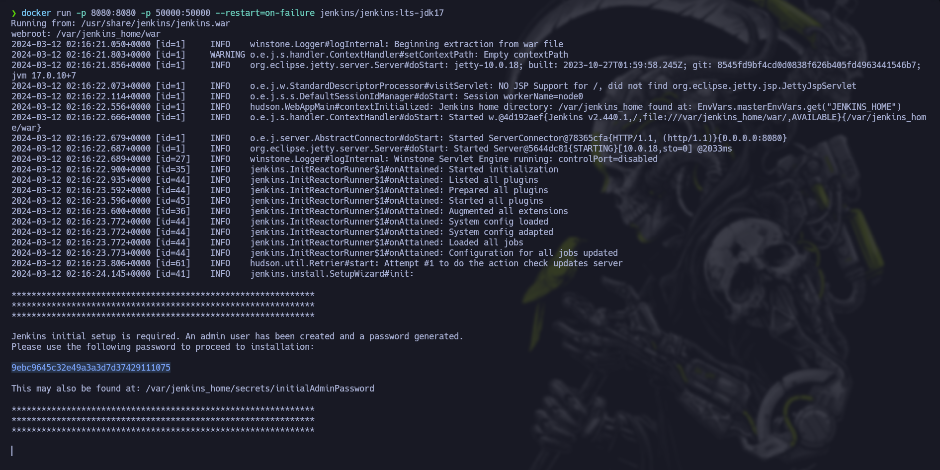 docker run -p 8080:8080 -p 50000:50000 --restart=on-failure jenkins/jenkins:lts-jdk17