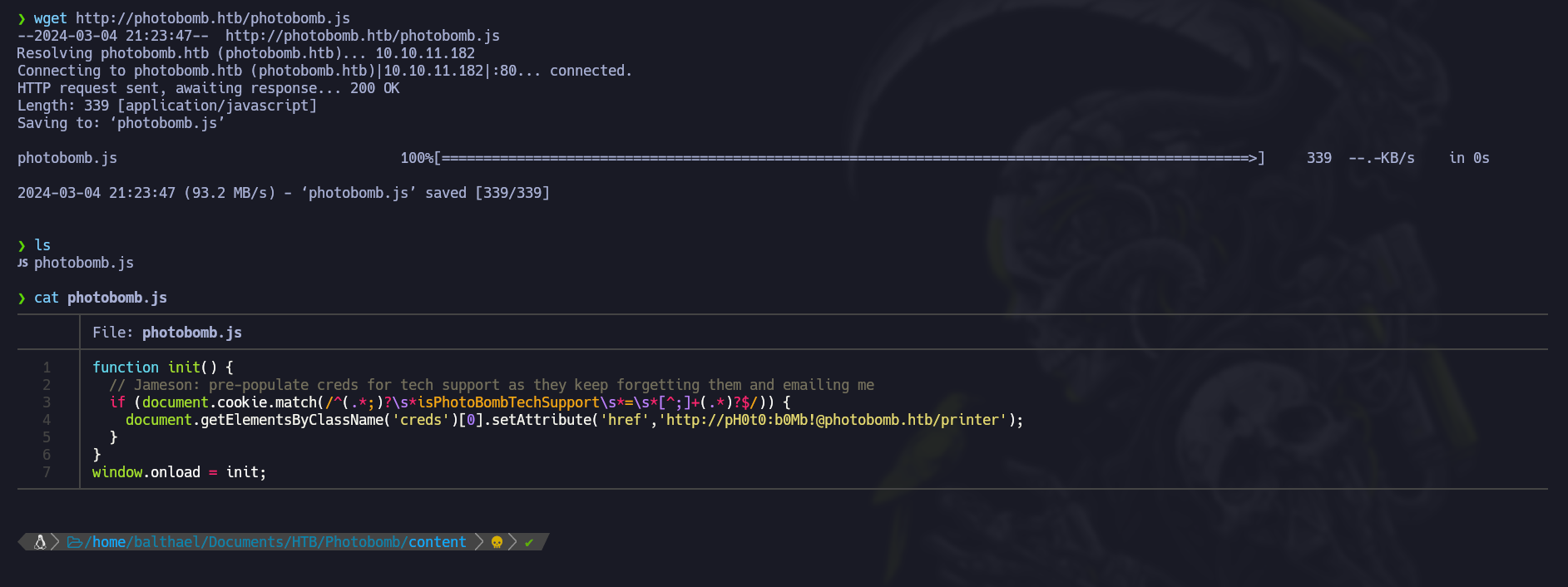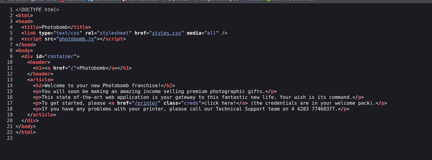 function init() { // Jameson: pre-populate creds for tech support as they keep forgetting them and emailing me if (document.cookie.match(/^(.*;)?\s*isPhotoBombTechSupport\s*=\s*[^;]+(.*)?$/)) { document.getElementsByClassName('creds')[0].setAttribute('href','http://pH0t0:b0Mb!@photobomb.htb/printer'); } } window.onload = init; - (