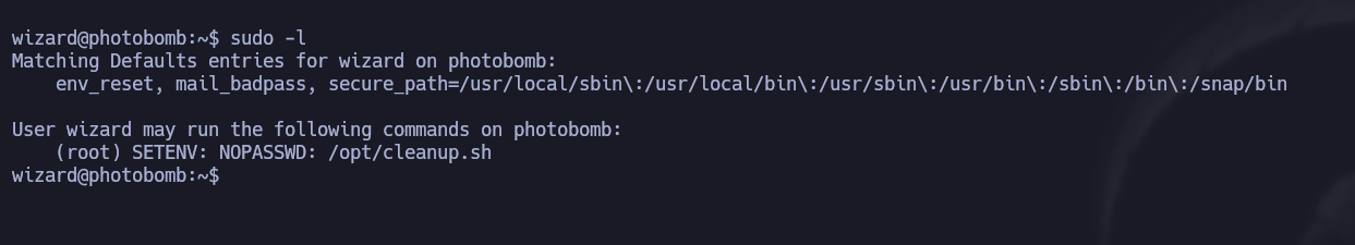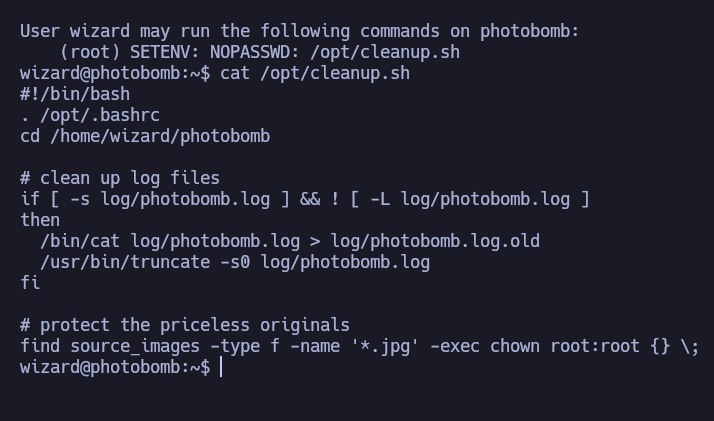 wizard@photobomb:~$ cat /opt/cleanup.sh- Este comando se está utilizando para mostrar el contenido del scriptcleanup.shque se encuentra en el directorio/opt/. -