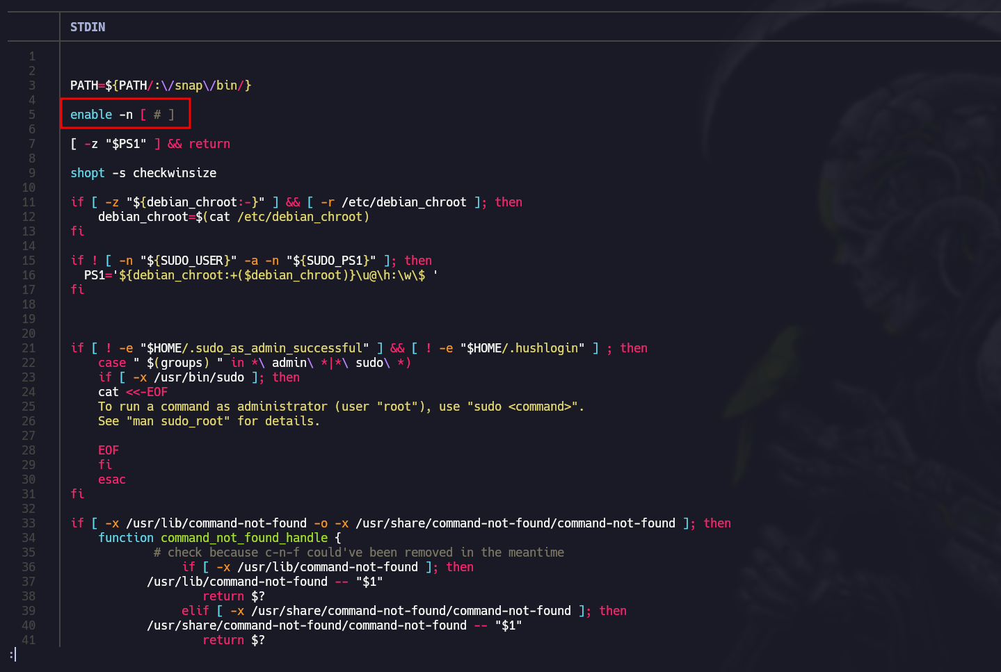 enable -n [ # ]En esta linea lo que hace es desactivar el comano[que es un comando propio de linux, podriamos aprovecharnos de eso, para cambiar su contenido y realizar un PATH Hijacking - Vamos al directio /tmp y creamos un archivo llamado