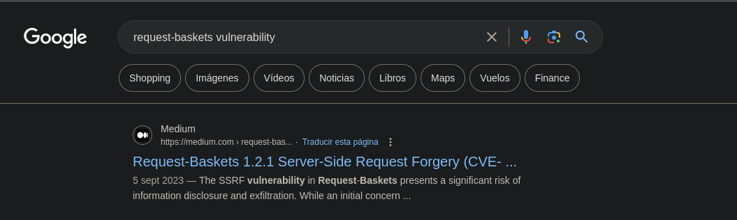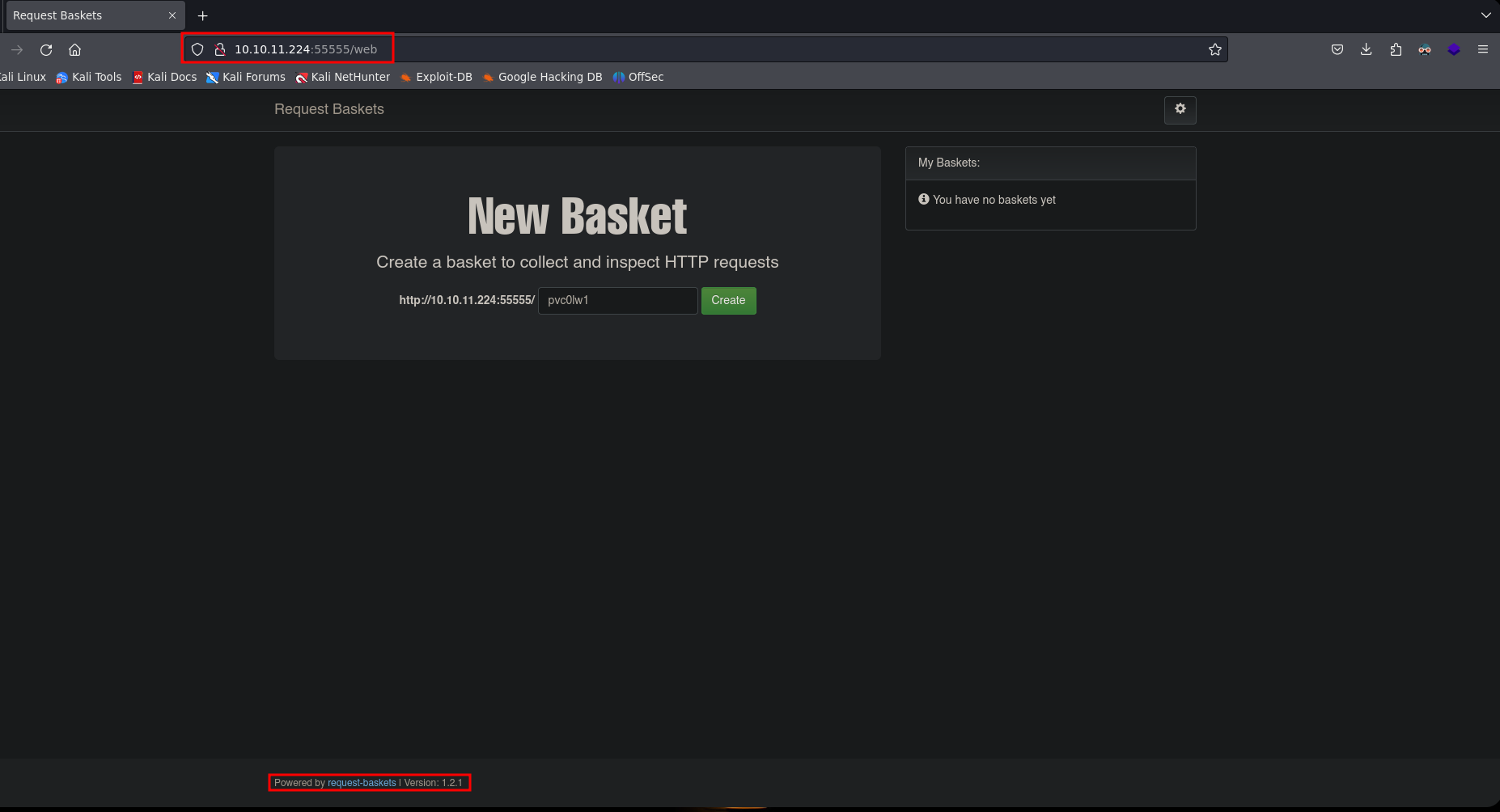 - Vemos en la parte inferior request-baskets con versión 1.2.1, eso para un atacante es oro porque nos indica la versión y servicio, se puede indagar de que se trata y buscar posibles vulnerabilidades.