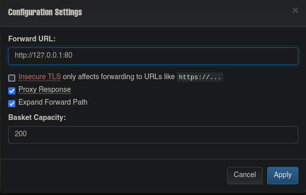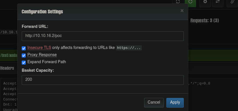 Por ejemplo, considere un escenario en el que el servidor aloja Request-Baskets en el puerto 55555 y simultáneamente ejecuta un servidor web Flask en el puerto 8000. Sin embargo, el servidor Flask está configurado para interactuar exclusivamente con el host local. En este contexto, un atacante puede explotar la vulnerabilidad SSRF creando una cesta que reenvía solicitudes a http://localhost:8000, evitando de manera efectiva las restricciones de red anteriores y obteniendo acceso al servidor web Flask, que debería haber estado restringido solo al acceso local.
