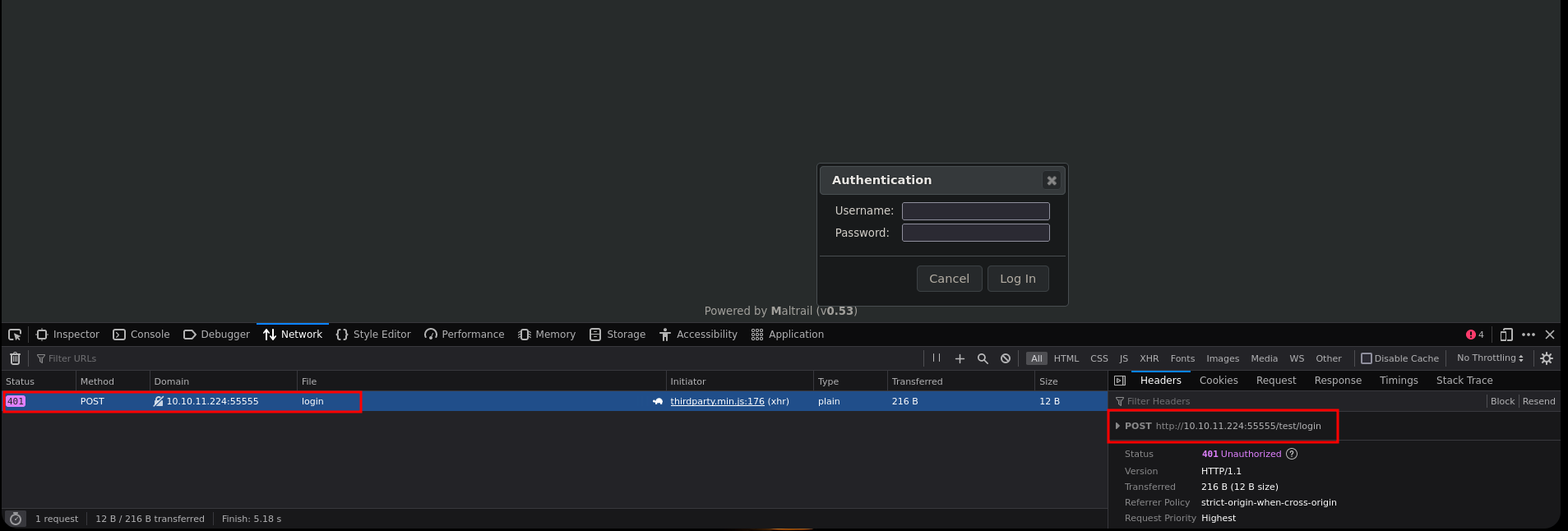 - Vemos que hace una petición por post a la ruta 10.10.11.224:55555/test/login