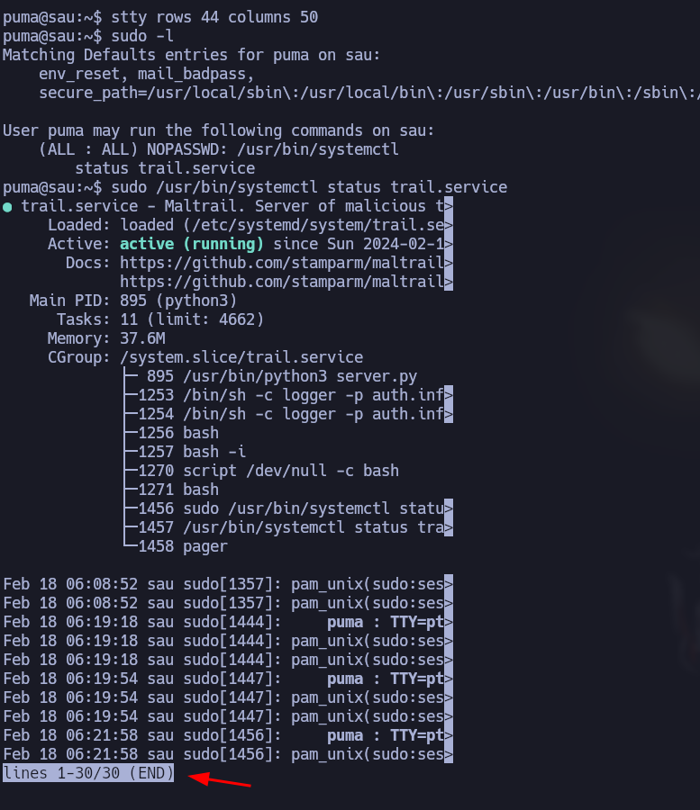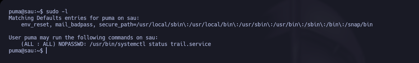 - vemos que puedo ejecutar sin proporcional contraseña este comando : /usr/bin/systemctl status trail.service