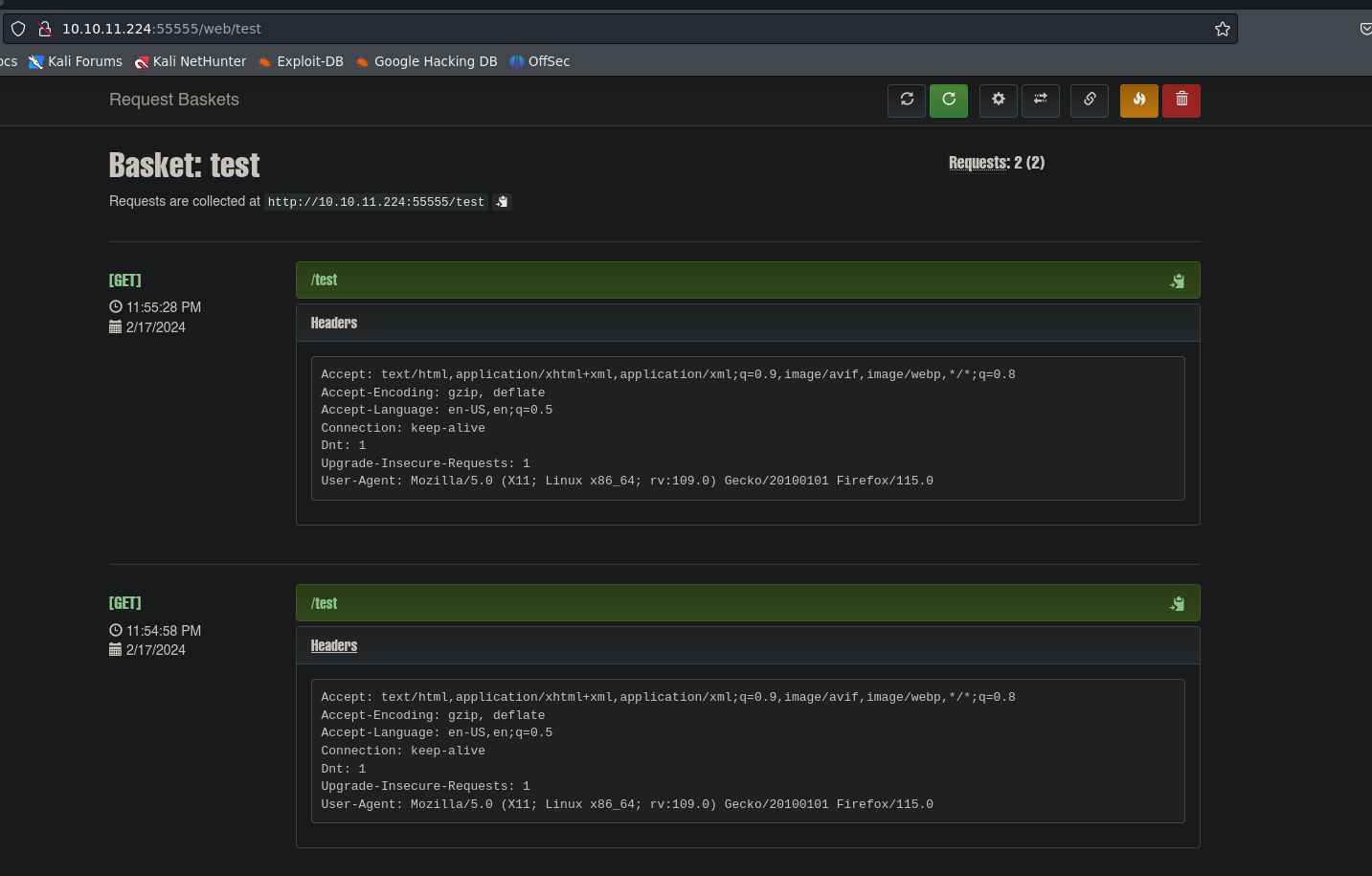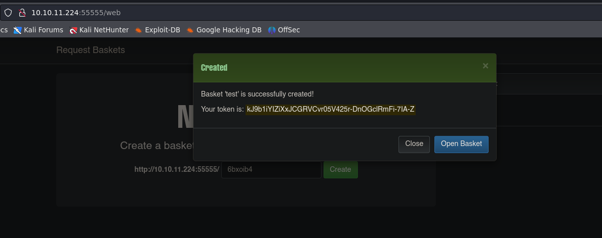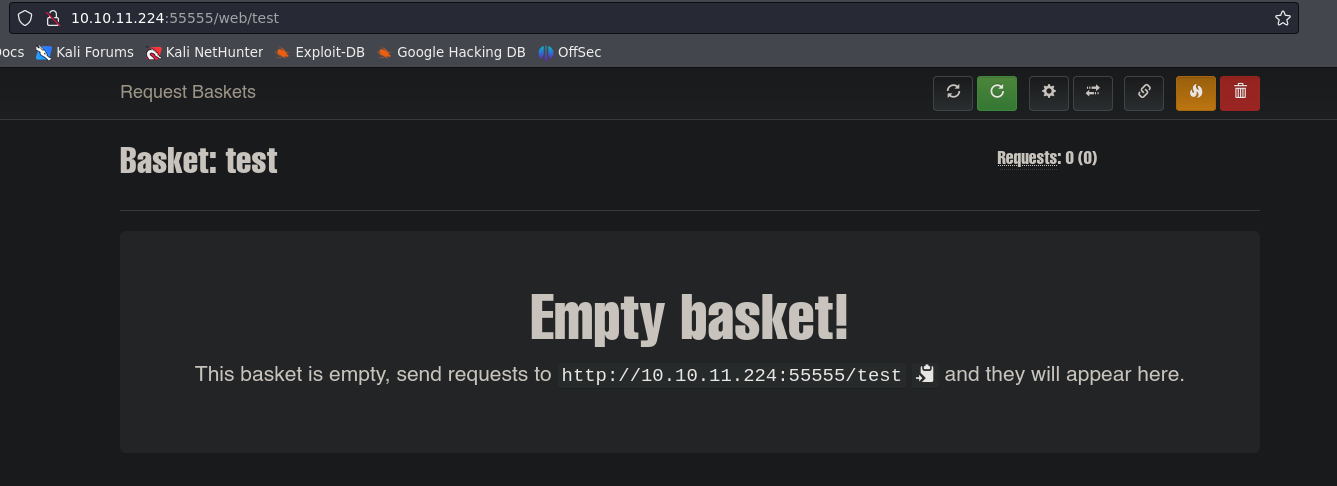 http://10.10.11.224:55555/web [200 OK] Bootstrap[3.3.7], Country[RESERVED][ZZ], HTML5, IP[10.10.11.224], JQuery[3.2.1], PasswordField, Script, Title[Request Baskets]